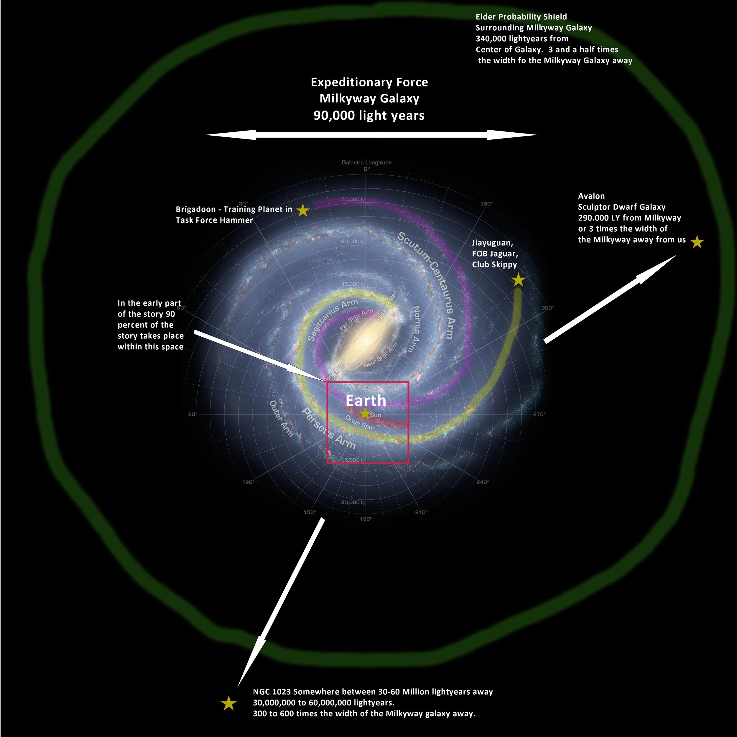 Here is a bonus from an ExForce fan, Terry Clements. In addition to being the first fan I ever met, and him staying at our house during Brayfest in 2019 (we’re still sorry about your truck, Terry), he is a huge nerd (I mean that in a good way). When he returned the draft EF17 manuscript with comments and corrections, Terry surprised me with a star chart that shows locations of major sites in and around the Milky Way!